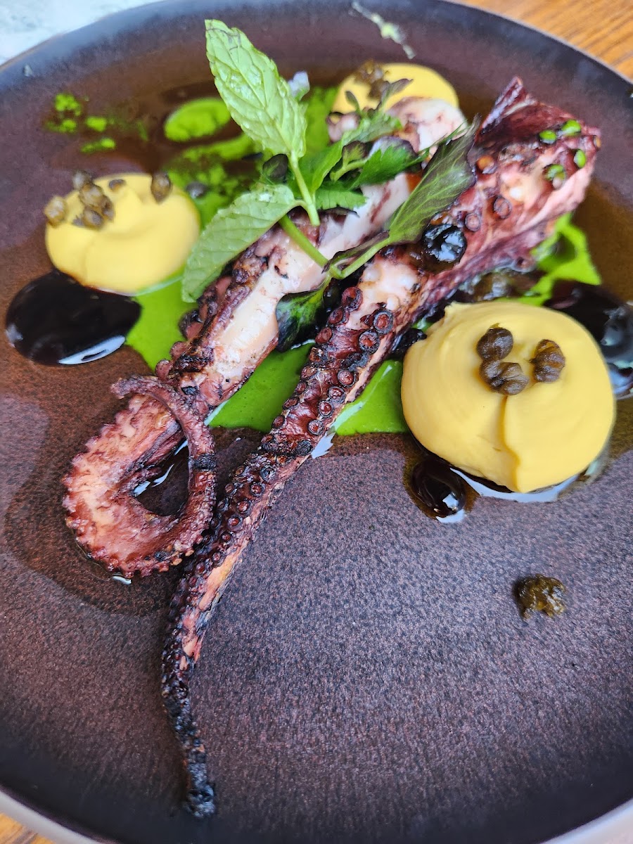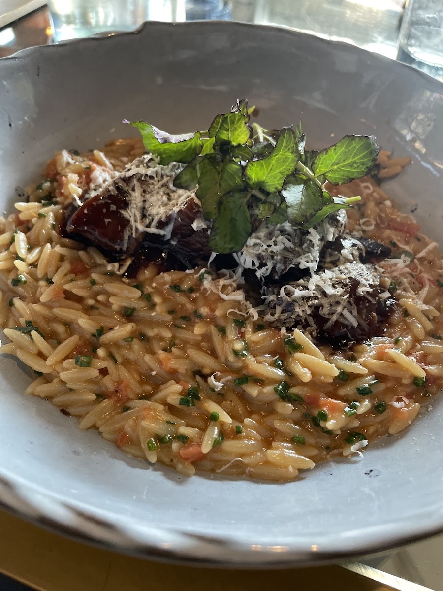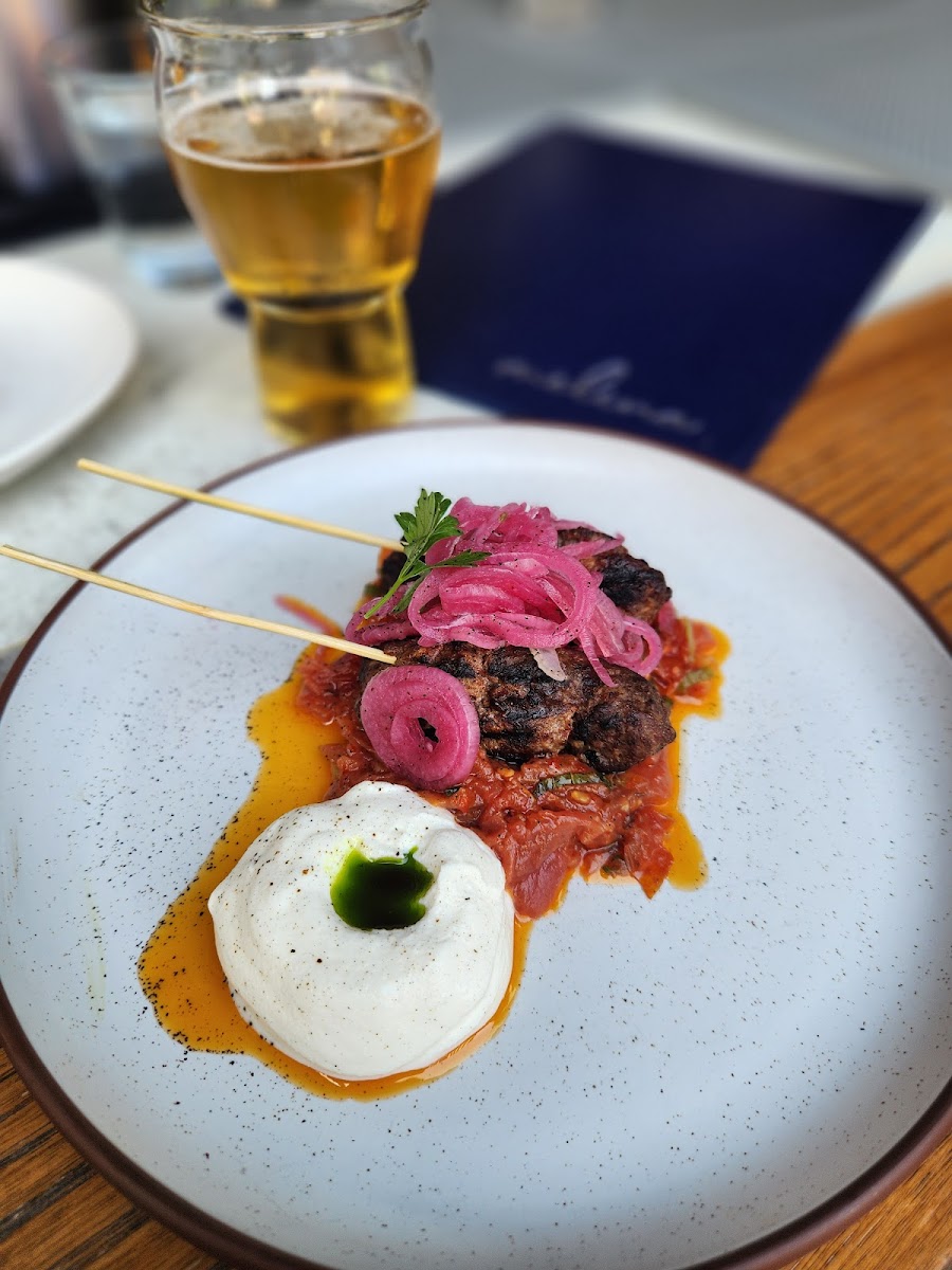 Now, let’s not overlook the desserts, where Melina truly shines! The 'Bougatsa,' an exquisite pastry filled with tonka bean custard, is beautifully complemented by a house-made cinnamon ice cream and rich chocolate caramel sauce for only $13. Or, treat yourself to the Greek Doughnuts, served with herb-infused honey, walnuts, and a spiced chilled chocolate milk for $16—it's a sweet ending you won’t want to miss.